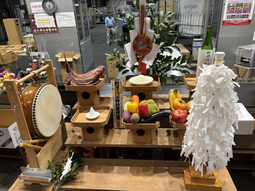 花の競りが始まる前の神事なので、6時過ぎには現地入りして祭壇等の設営をします。とても広い市場に響く太鼓、笛、そして祝詞。とても厳かな雰囲気の中での神事であります。