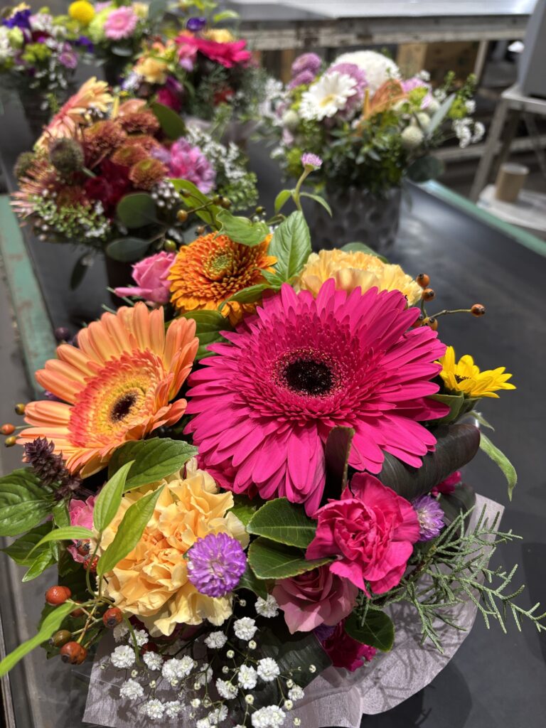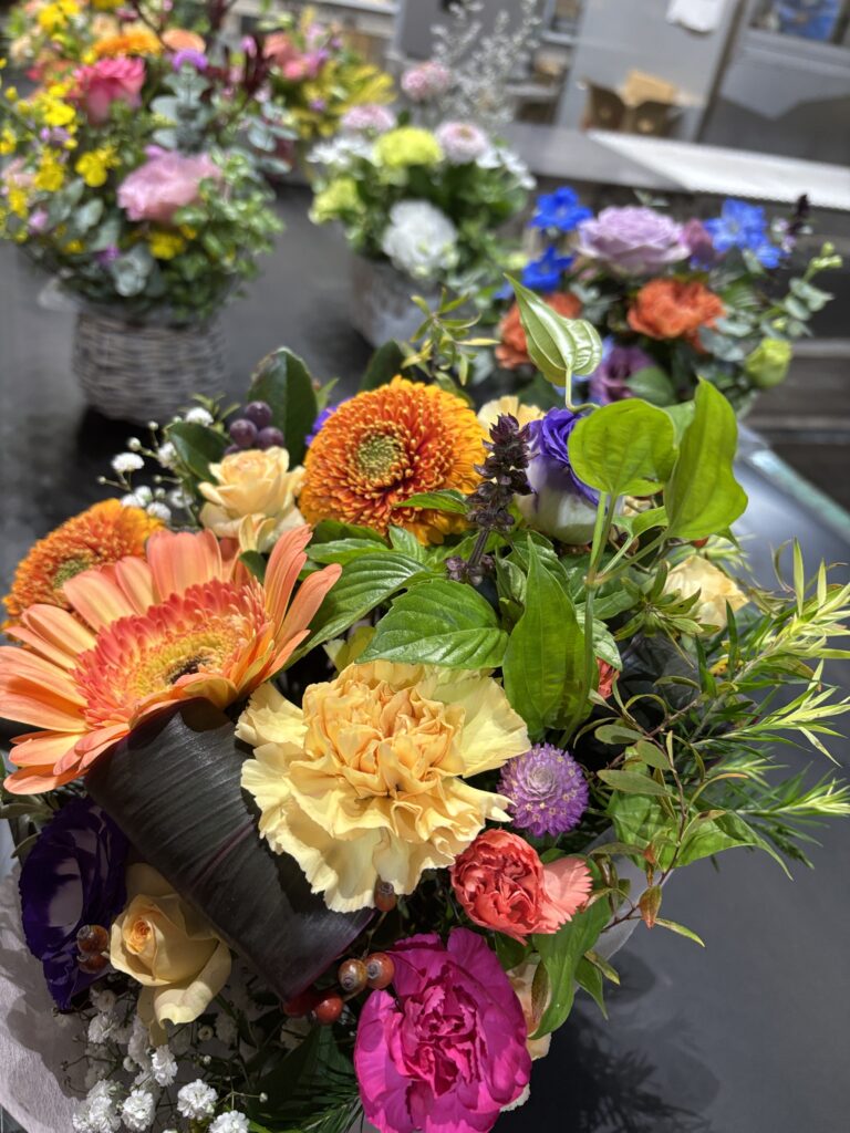 神前には他にフラワーアレンジメントが沢山。幼稚園や施設に寄付されるとの事。皆さん様々に思考を凝らして美しく仕上げていらっしゃいます。