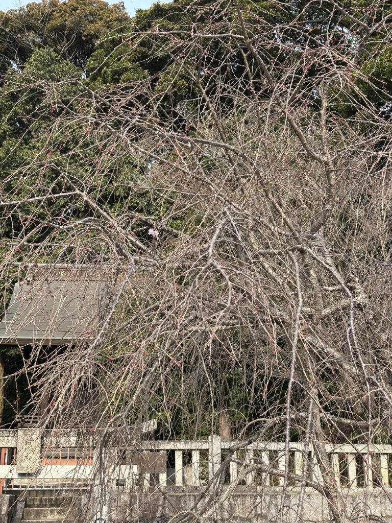 本日、境内の枝垂れ桜が花を開きました。