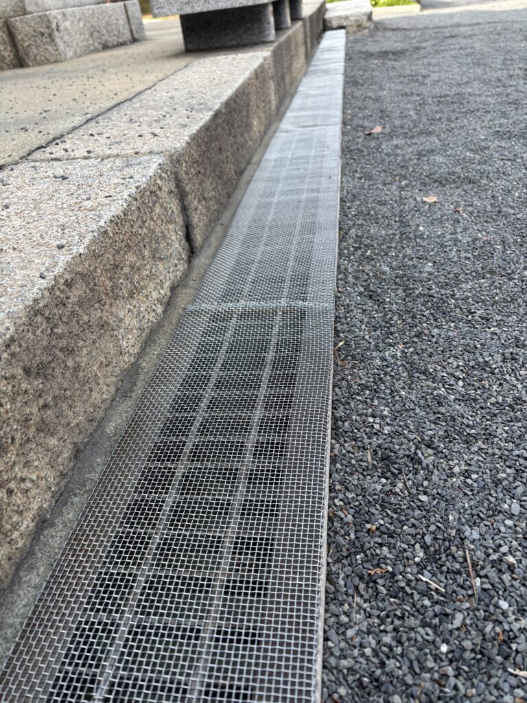 神殿の前に側溝があります。ちびっ子達は、砂利遊びが大好きなので、溝の中に大量の砂利を投入します。毎回、掃除が大変なので、ちびっ子達には申し訳ないが側溝のフタ(グレーチング)に網をかけました。前回かけてから早5年位。サビサビになったので、朝から取り替えの作業です。